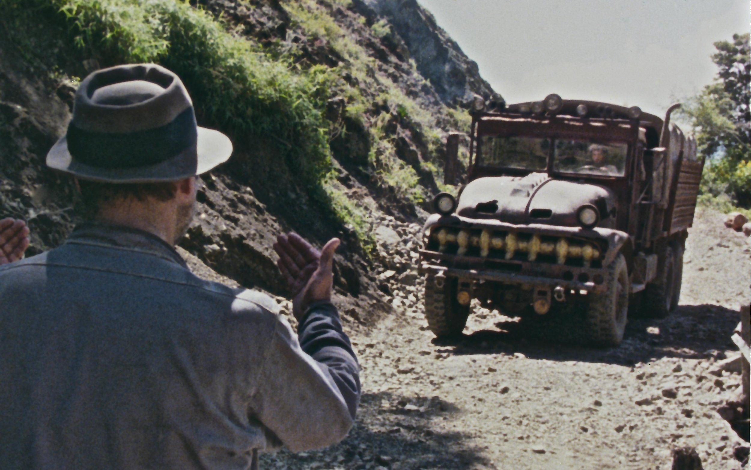 I’ve been going on and on about what this movie is, but I haven’t written a word of what it’s about. A prolonged prologue, populated by what some critics call “vignettes,” introduces us to the four protagonists: Nilo (Francisco Rabal) is a hitman who flees the scene of his latest crime in Veracruz; Kassem (Amidou) is a bomber who works with a terrorist cell in Israel; Victor Manzon (Bruno Cremer), a French banker, flees the country to escape charges of loan fraud; and Jackie Scanlon (Roy Scheider, by far the most recognizable face in the cast), a mob driver, escapes to South America after a robbery goes south. All four men are chosen to transport cargoes of highly volatile nitroglycerin in two massive trucks on a 200-mile path through a dangerous jungle to put out a chemical fire.