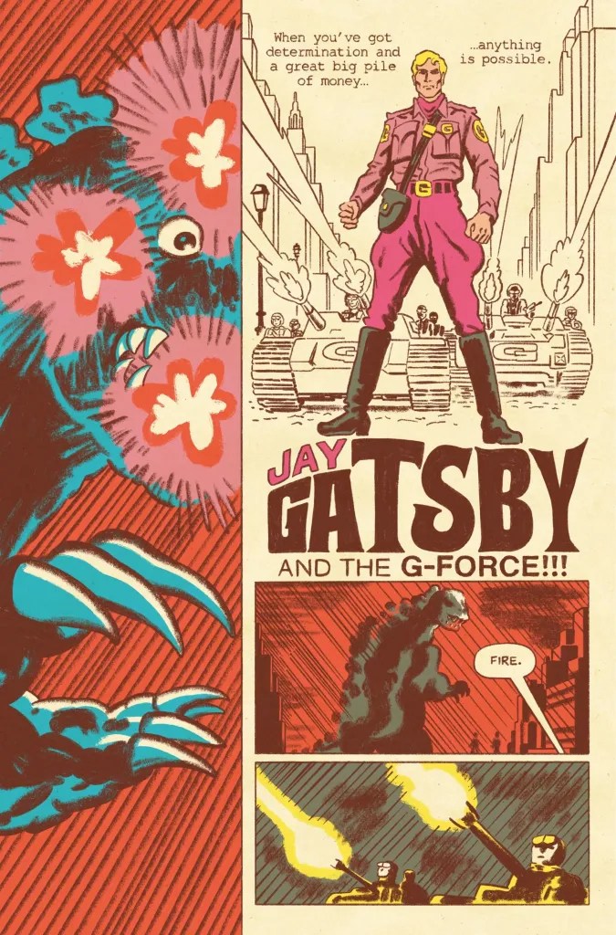 On the surface, it shares some similarities with Alan Moore’s The League of Extraordinary Gentlemen, which teams up famous literary characters like the Invisible Man, Captain Nemo, and Allan Quatermain to defeat similarly extraordinary threats. Monsterpiece Theatre doesn’t get too ahead of itself, instead choosing to begin with an abbreviated version of a CliffNotes summary of The Great Gatsby: we meet Jay Gatsby in 1917 as he begins a relationship with Daisy Fay before leaving to fight in the First World War. Years later, in 1922, Daisy has married the brash and impulsive (but very wealthy) Tom Buchanan, and Gatsby throws luxurious parties at his Long Island mansion to get Daisy’s attention. We’re not even introduced to the original novel’s iconically unreliable narrator Nick Carraway until eight pages in, after the King of the Monsters suddenly rises out of Long Island Sound, hell-bent on random destruction.